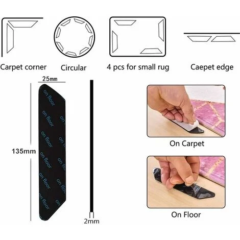 Tapis antidrapant -Adhsif et scurit suprieures: Idal pour toutes sortes de tapis, ronds, rectangulaires, carrs, l’intrieur et l’extrieur, efficace sur les sols en bois, carrelage, marbre, stratifi et linolum. Vous pouvez les essuyer pour augmenter leurs proprits adhsives. Frottez simplement un peu d’alcool ou d’eau. Il ne laisse pas non plus de rsidu collant!.