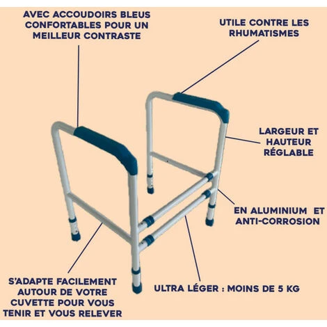 - Ces accoudoirs de toilettes sont très légers et pèsent moins de 5 kg grâce à leur structure en aluminium prévue pour résister à la corrosion.