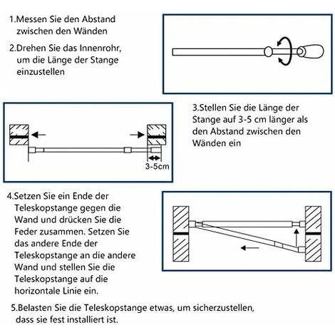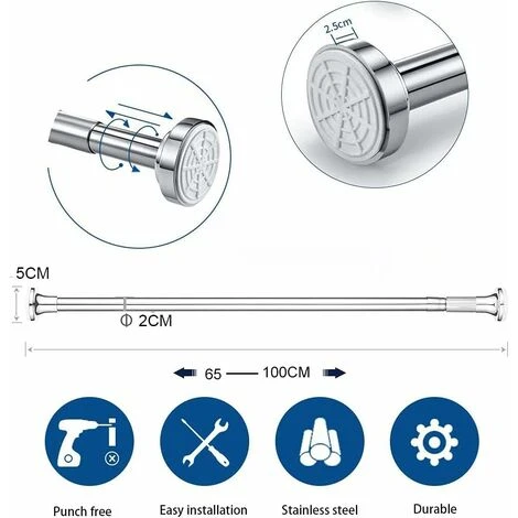 Tringle de douche sans perçage : sans casser le mur, la tringle de rideau de douche peut être maintenue en toute sécurité par tension physique. Vous pouvez également étendre la barre de douche en la tournant de 65 cm à 100 cm.