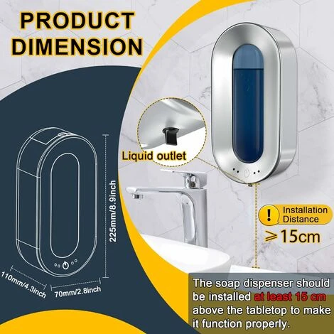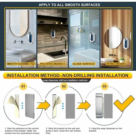 Distributeur de savon mural et 2 méthodes d’installation: Le distributeur de savon mural sans contact, en matériau ABS de haute qualité, économise plus d’espace. Deux méthodes d’installation, l’installation de forage et l’installation sans forage, sont fournies, qui sont pratiques à installer, adaptées à divers environnements et tiennent pleinement compte des différentes demandes.(Remarque: le distributeur de savon doit être installé à au moins 15 cm au-dessus du plateau)