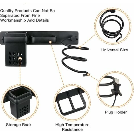 laisser un sèche-cheveux en toute sécurité dans le support au lieu d’attendre qu’il refroidisse. - Propre et bien rangé : le séchoir à cheveux en spirale ne prend pas beaucoup de place, car il est juste suspendu au mur ou fixé sur le côté de la table de maquillage. Il aide à ranger l’ensemble de l’électricité près de la commode pour empêcher le désordre sur le sol et garder la chambre ou la salle de bain bien rangée.