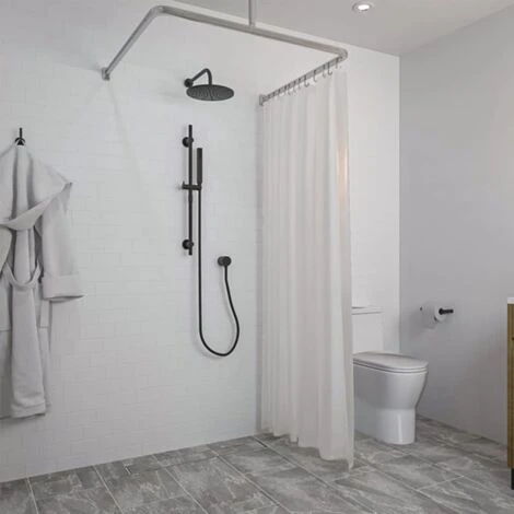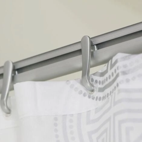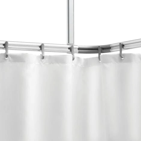 Cet ensemble se compose de trois tringles de douche droites avec rails intégrés, de deux pièces de raccordement courbées, de douze crochets et d’un support de plafond. Les tringles à rideau de douche sont faciles à découper. Le support de plafond est fixé au rail de sorte que les crochets avec le rideau de douche puissent être déplacés librement de gauche à droite et vice versa le long des rails.