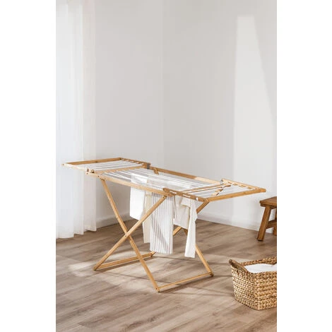 L´étendoir à linge pliant Koali est l’accessoire parfait pour sécher les vêtements à l’extérieur ou à l’intérieur à la maison. Elle est idéale à placer sur le balcon, le jardin, la terrasse ou à l’intérieur de la maison en cas de mauvais temps. Le séchage des vêtements est une tâche domestique que nous devons tous faire pratiquement tous les jours, et pour cela votre allié parfait est Koali. Il est fabriqué en bois de bambou, un matériau résistant, élégant et polyvalent qui se marie parfaitement avec de nombreux styles décoratifs.Tous les produits qui sont placés à l’extérieur nécessitent des soins particuliers, évitez de les exposer aux intempéries et à l’humidité, ainsi que de les laisser au soleil pendant une longue période, stockez-les à l’abri lorsque vous ne les utilisez pas et surtout pendant les mois d’hiver. Dimensions (Hauteur x Largeur x Profondeur): 82,5 cm x 154 cm x 59 cm IMPORTANT : Le service standard porte-à-porte ne comprend pas la livraison et la collecte des marchandises au domicile du client, qui sont à la charge de ce dernier. Il est possible que le livreur aide volontairement à la livraison de la marchandise (ceci est totalement volontaire pour le livreur et la société de transport et ne relève pas de la responsabilité de Sklum).L’assemblage n’est pas non plus inclus.