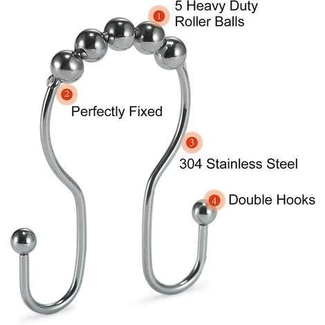 Structure résistante à la rouille : les crochets de rideau de douche sont fabriqués en acier inoxydable 304 de haute qualité et processus de galvanoplastie. Il est durable, résistant à la rouille et à la corrosion, parfait pour les environnements humides de salle de bain.