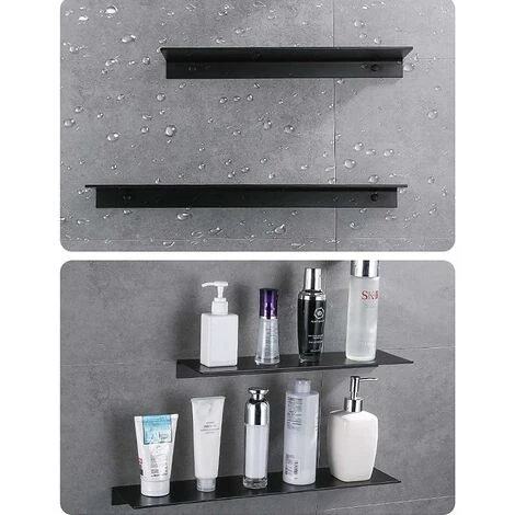 Etagère murale mince , fabriquée en aluminium noir lisse et solide. Super facile à installer avec les raccords inclus. Notre étagère flottante noire s’adapte à tous vos cosmétiques, parfums, shampooings et accessoires pour bébé.