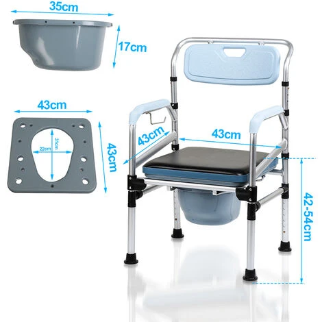 【Réglable en hauteur 6 fois】La hauteur d’assise et la hauteur du dossier peuvent être réglées grâce aux pieds télescopiques. Assise extra large : 43x43cm, taille : 55x48x84cm (LxlxH). Chaise WC Design pliable, le cadre du siège et le support peuvent être pliés Retirez-le pour le ranger et le transporter.