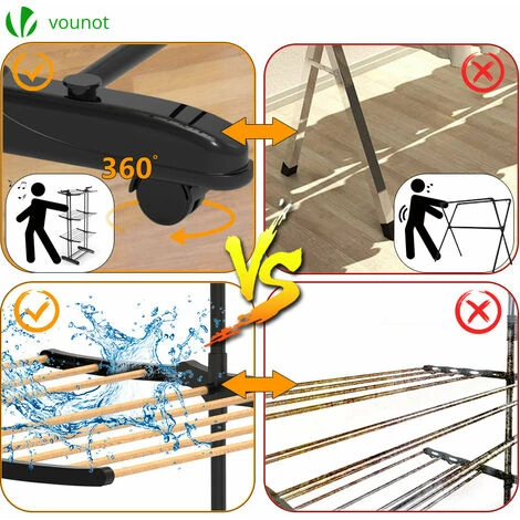 - Avec deux pieds et 4 roues intégrées, vous pouvez facilement déplacer notre étendoir partout.