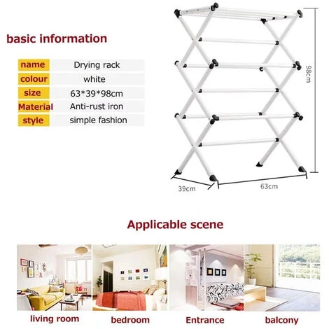A propos de l’article : dimensions : 63X39X98cm. Poids : 1.83kg. Matériau: acier antirouille: Capacité de sécharge d’environ 50kg de linge.Produit de haute qualité: cet article est fabriqué de l’acier antirouille, durable, stable et garantir une utiilistion sûre. Convient aussi à l’usage intérieur et extérieur pour des fins de sécher vos vêtements ou serviettes.Facile à utiliser: barreaux plus épais et plus stables, même l’étendoir est chargé pleinement, la structure reste stable. De plus, le pliage est une caractéristique importante de ce type d’étendoir. Si vous ne le servez pas, vous pouvez le plier et le mettre dans un coin, afin de gagner d’espace dans la salle.Montage facile : équipé d’un manuel d’emploi, vous n’aurez pas besoin d’autres outils, même les femmes peuvent l’assembler facilement. il suffit de suivre 4 étapes pour assembler. Vous pouvez l’utiliser dans votre studio ou votre maison.Multi fonction : un désign simple, convient aux chambres d’enfant, l’intérieur, le balcon ou le couloir, etc., vous permet de ranger des choses dans un petit espace. Non seulement pour ranger vos vêtements, en tant qu’étendoir, il peut aussi se servir lors de la raison humide. Mâme pour les jours de pluie ou les maisons sans balcon, vous pouvez l’utiliser quand même.Installation facile: équipé d’un manuel d’utilisation, ce manuel vous aidera de l’assembler étape par étape. Nous vous fournirons également toutes les pièces et tous les outils nécessaire. Si vous rencontrez des probèmes lors de l’installation, veuillez nous contacter.