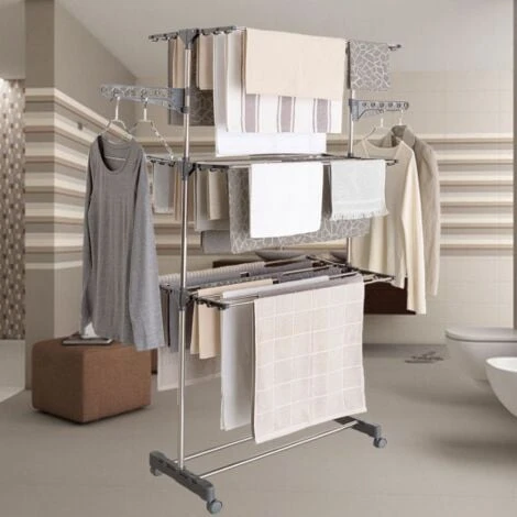 L’étendoir à linge intérieur MAXIMA deviendra rapidement votre meilleur allié au moment de sécher la lessive. Grâce à ses 3 niveaux indépendants, il met à votre disposition une grande capacité d’étendage (jusqu’à 20 mètres). Grâce à sa grande hauteur de 1,45 mètre, vous pouvez aisément faire sécher du linge encombrant (linge de lit, peignoir, drap de bain, etc.).Pour compléter cette surface disponible, le séchoir à linge est équipé d’accessoires pratiques et ingénieux :- Deux porte cintres rabattables, idéals pour faire sécher des chemises sans les froisser. Ils sont conçus pour accueillir 6 cintres chacun.- Une double barre support, permettant de faire sécher des chaussures- 36 clips permettant d’étendre la lingerie délicate- 4 roues, pour un déplacement facile entre les différentes pièces de la maison – 2 roues équipées de freins pour stabiliser le séchoirEn plus de sa grande capacité pour étendre votre lessive, le séchoir à linge MAXIMA est particulièrement discret ! Grâce à son format repliable, l’étendoir se glisse dans les petits espaces comme un placard ou derrière une porte en un tour de main.Ses montants en plastique et ses barres en acier inoxydables font du MAXIMA un séchoir robuste et pratique. Faites sécher toute votre lessive grâce à cet étendoir pratique, à prix réduit!Dimensions du séchoir à linge MAXIMA- Dimensions déplié : Longueur 79,5 CM x largeur 57,5 CM x Hauteur 145 CM- Longueur avec les 2 extensions dépliées : 141 CM- Dimensions replié environ : L.79,5 x l.11 (42,5 au sol) x H.145 CM- Matériaux : acier inoxydable + plastique ABS- Coloris : gris- Contient 2 porte-cintres, 36 clips lingerie et double barre pour chaussures- 4 roues dont 2 à frein – À monter soi-mêmeCe modèle de séchoir à linge MAXIMA existe en différents coloris et plus d’accessoires : – Séchoir à linge inox MAXIMA gris étendoir pliable H.145 CM + 30 accessoires- Séchoir à linge inox MAXIMA prune étendoir pliable H.145 CM- Séchoir à linge inox MAXIMA noir et aspect bois étendoir pliable H.145 CM