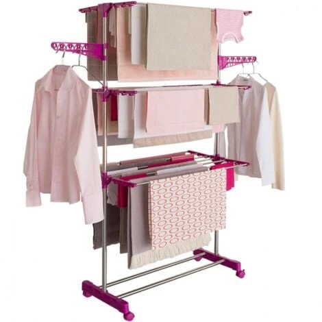 Descriptif du séchoir à linge coloris prune en inoxL’étendoir à linge intérieur Maxima coloris prune deviendra rapidement votre meilleur allié au moment de sécher la lessive. Grâce à ses 3 niveaux indépendants, il met à votre disposition une grande capacité d’étendage : jusqu’à 20 mètres. Grâce à sa grande hauteur de 1,45 mètre, vous pouvez aisément faire sécher du linge encombrant (linge de lit, peignoir, drap de bain, etc.).Pour compléter cette surface disponible, le séchoir à linge Maxima est équipé d’accessoires pratiques et ingénieux : – Deux porte cintres rabattables, idéals pour faire sécher des chemises sans les froisser. Ils sont conçus pour accueillir 6 cintres chacun.- Une double barre support, permettant de faire sécher des chaussures- 36 clips permettant d’étendre la lingerie délicate- 4 roues, pour un déplacement facile entre les différentes pièces de la maison – 2 roues équipées de freins pour stabiliser le séchoirEn plus de sa grande capacité pour étendre votre lessive, le séchoir à linge Maxima est particulièrement discret ! Grâce à son format repliable, l’étendoir se glisse dans les petits espaces comme un placard ou derrière une porte en un tour de main.Ses montants en plastique et ses barres en acier inoxydables font du Maxima un séchoir robuste et pratique. Faites sécher toute votre lessive grâce à cet étendoir pratique, à prix réduit!Dimensions du séchoir à linge MAXIMA- Dimensions déplié : Longueur 79,5 CM x largeur 57,5 CM x Hauteur 145 CM- Longueur avec les 2 extensions dépliées : 141 CM- Dimensions replié environ : L.79,5 x l.11 (42,5 au sol) x H.145 CM- Matériaux : acier inoxydable + plastique ABS- Coloris : prune- Contient 2 porte-cintres, 36 clips lingerie et double barre pour chaussures- 4 roues dont 2 à frein – À monter soi-mêmeCe modèle de séchoir à linge MAXIMA existe en différents coloris et plus d’accessoires : – Séchoir à linge inox MAXIMA gris étendoir pliable H.145 CM + 30 accessoires- Séchoir à linge inox MAXIMA gris étendoir pliable H.145 CM- Séchoir à linge inox MAXIMA noir et aspect bois étendoir pliable H.145 CM