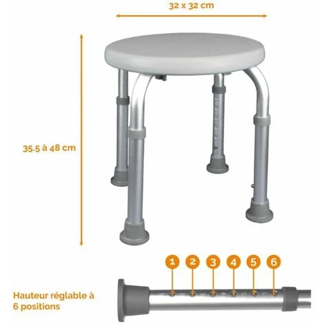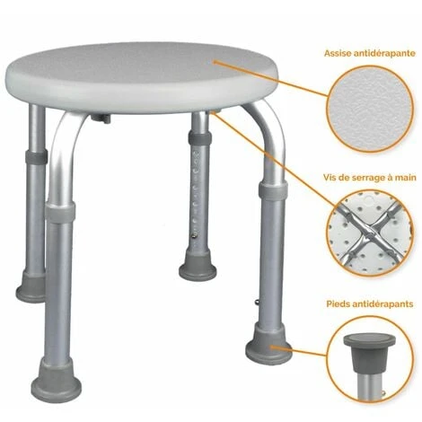 Très pratique, le tabouret de douche rond est ajustable en hauteur, pouvant ainsi convenir à chaque personne.