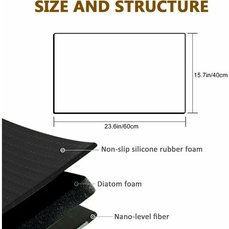 Facile à Nettoyer et à Entretenir – Surface lisse conçue pour résister à la saleté et aux cheveux. Par conséquent, vous n’avez pas besoin de nettoyer le tapis de bain tous les jours. Lorsqu’il y a des taches, il suffit de le laver à l’eau courante ou de l’essuyer avec un chiffon humide, ou d’utiliser du papier de verre pour poncer doucement la surface si nécessaire, puis de sécher à l’air libre