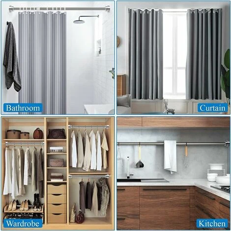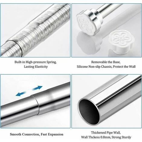 au crochet. Le silicone antidérapant aux deux extrémités empêche non seulement de glisser, mais protège également le mur Il n’endommage pas le mur et ne laisse pas de traces pendant le processus de démontage. [Multi-fonction]: La tringle de tension peut être utilisée comme tringle à rideau de douche / tringle à rideau / comme tringle à vêtements / tringle de placard / cintre / porte-casserole / peut également être utilisée dans la cuisine pour accrocher des
