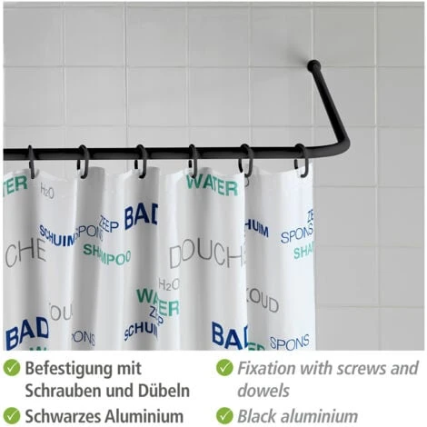 Pratique et d’utilisation universelle, la barre d’angle offre des possibilités de suspension pour les rideaux qui doivent être accrochés aux angles de douche ou de baignoire. Pour cela, elle donne trois possibilités de combinaison de longueurs différentes : Pour les angles de douche avec deux côtés ouverts : 80 x 80 ou 90 x 90 cm Pour les angles de douche avec trois côtés ouverts : 80 x 90 x 80 cm ou 90 x 80 x 90 cm Pour les angles de baignoire avec deux côtés ouverts : 70 x 165 cm Les différents éléments s’emboitent simplement les uns dans les autres et se fixent ensuite au mur à l’aide de vis et de chevilles. Le matériel de fixation est fourni. Fabriquée en aluminium léger à l’aspect noir, elle a un diamètre de 20 mm adapté aux rideaux de douche et de baignoire courants dans le commerce. La garantie du fabricant est de cinq ans. Pour ce produit, vous bénéficiez d‘une garantie de 5 ans à compter de la date d‘achat. La garantie porte sur tous les vices de matériau et de fabrication qui altèrent le bon fonctionnement. Sont exclus les dommages résultant d‘une utilisation incorrecte ou de l‘usure naturelle. La garantie ne restreint aucun de vos droits à la garantie légaux. En cas de garantie, veuillez renvoyer gratuitement l‘article accompagné du ticket de caisse et convenablement emballé pour le transport à l‘adresse suivante : Wenko-Wenselaar GmbH & Co. KG · Abteilung « Retouren » Im Hülsenfeld 10 · 40721 Hilden, Allemagne [email protected]
