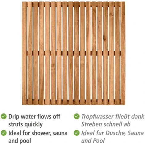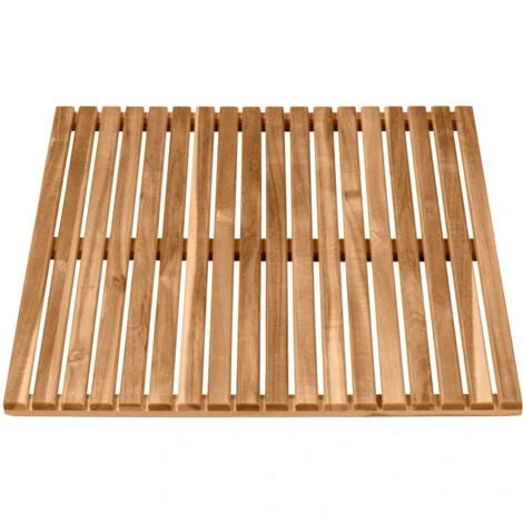 - Superbe aussi à l’extérieur : La grille de bain peut être utilisée sans problème à l’extérieur. Dans un sauna ou une piscine, ce tapis assure une bonne stabilité et séduit également par son aspect naturel. Près des piscines ou sur la pelouse, la grille carrée en bois s’intègre dans l’environnement naturel du jardin.