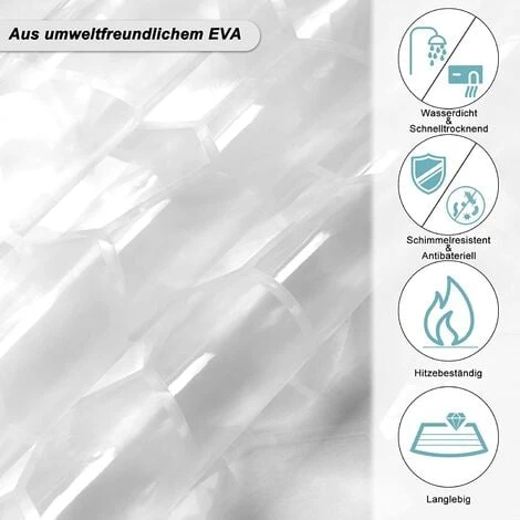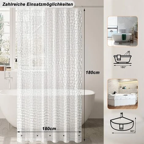 -Matériaux : Rideau EVA (sans PVC). Anneaux de suspension en plastique ABS. Œillets en aluminium.-Couleur : Semi-transparent-Taille (L x H) (cm) : 180×180-Poids correspondant (kg) : 0.35-Livraison : 1x Rideau de douche. Croche